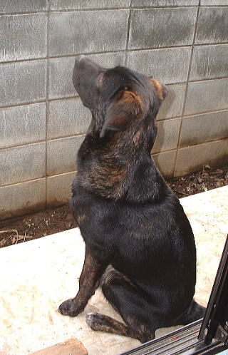 庭に出て、ブロック塀越しに、お隣のお家を見上げるムサシ。