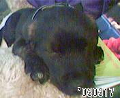 | 2003.3.18 tue. 体重は5キロ 朝、大きいお兄ちゃんに抱っこされて体重計に乗ったら、69キロ。僕を下ろして計ったら64キロ。つまり、僕の体重は5キロ。急に大きくなったみたい。どこまで大きくなるのかな? ルナ母さんくらい大きくなったりして……。 2003.3.19 wed. 僕は噛みたい!! 噛みたいの!噛みたいのといったら噛みたいの! 誰がなんと言っても、カミカミしたいの。 何で怒るの? 何で怒るのよー? わかんないなー。(そりゃやっぱり痛いもんね。スリッパと間違えられて足の指噛まれてごらん) 2003.3.20 thu. 忍び足のパパ 最近、パパは、朝、起きると2階から忍び足で階段を下りて1階へ。そして、居間のドアをソーっと開けるんです。なんでー!? た・ぶ・ん、それはね、「眠っている僕の愛らしい姿を見たい」「どこで寝ているか確かめたい」「パパを見つけて喜ぶ僕を見たい」のよ。今朝は、ちゃーんと、ソファーの上のムートンベッドに寝てました。○○○は4か所にしてました。イェイ。 2003.3.21 fri. 暴れん坊将軍ムサシ 今日も部屋の中を駆け回って、ジャンピングアタックとカミカミ攻撃練習をたっぷりしたゾ。「われ男の子、意気の子、名の子、ああ、剣の子」。日本男児ここにあり、じゃなかった、洋犬だった。足も長いし、眼も青かった……。 |