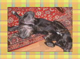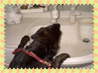 | 第35週 (生後9ヶ月16日〜) 2003.10.25 sat 諏訪湖マラソン パパは、明日、諏訪湖マラソンで走るとか。今朝もジムで走ってきたらしい。「走るだけなのに、なにが楽しいのかしら」とママが言ってます。ボクは走るのが好きさ。 10.26 sun 3分短縮 パパの諏訪湖マラソンのタイムは、昨年より3分短縮したとか。エライ。でも、週末なのに、散歩に連れて行ってくれなかった。疲れたんだって。しかたないなー。ボクがいつものように、ママを引き回して散歩させてあげた。 10.27 mon 「ムサシの開き」 眠い時のボク、仰向けで、後足はビローンと開いて、前足はかわいらしく曲げている。こういうときはお腹を撫でてね。今も、ママのイスの下で、この格好だよ。それを見て、大兄ちゃんは「鯵の開き」って言った。 10.28 tue ガム代わり 長〜い時間のお留守番でした。たいていは眠ってるけど、ひとりぼっちは寂しいから、つい、口寂しくて。おしゃぶり代わりに、玄関の縁板をカミカミ。カミ具合はとてもいい。天然の木だし。 10.29 wed ファンヒーターの前 新しいガスファンヒーターが来た。吹き出し口からちょっと離れた場所が、ボクのお気に入りの場所になりそう。鼻が乾くぜ。 10.30 thu カミカミ防御薬登場 中兄ちゃんが、ボクが噛みたくなくなるようなものを吹き付けるスプレーを買ってきた。そんなの効き目あるの? へぇー。クイズトリビアなら、せいぜい50ヘェーだな? 家をボクの牙で破壊される前に防御するんだって。 10.31 fri 破壊ストップ スプレーのせいで、玄関の縁板をカミカミ攻撃できなくなっちゃいました。ふ〜んだ。ふてくされてやる。スリッパをかむぞー |